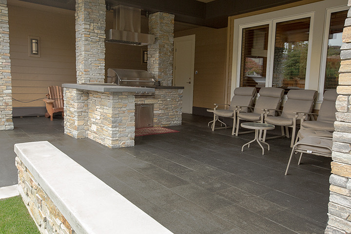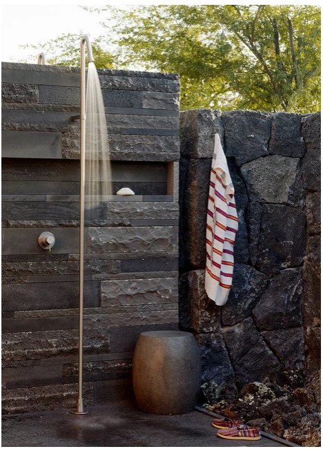 Đá bazan đen làm tiểu cảnh, phòng tắm ngoài trời, không gian resort